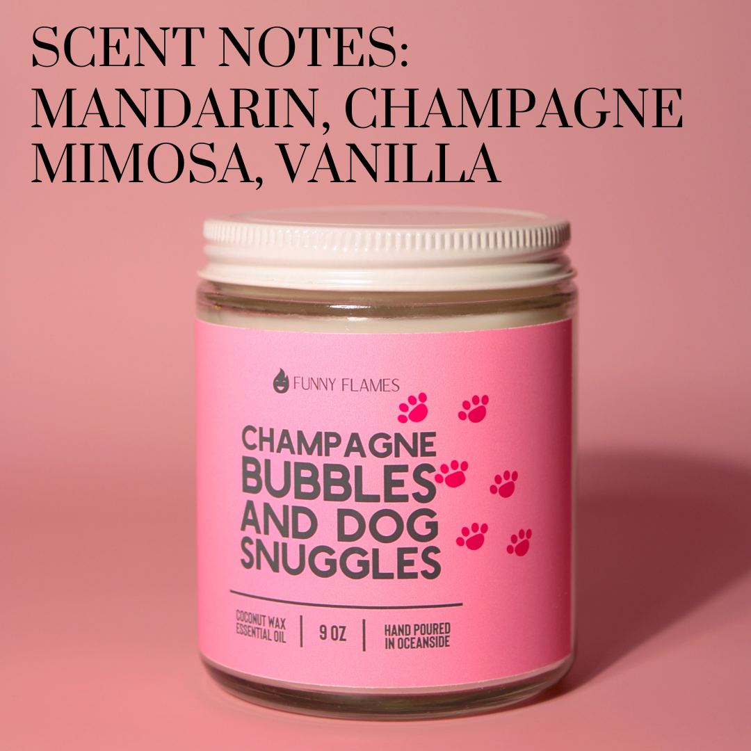 Introducing our latest creation, Champagne Bubbles And Dog Snuggles scented candle! With a delightful blend of Mandarin, Champagne Mimosa, and Vanilla, this candle is sure to fill your home with a warm and cozy atmosphere that will have you feeling like you're wrapped up in a cozy blanket with your furry best friend.